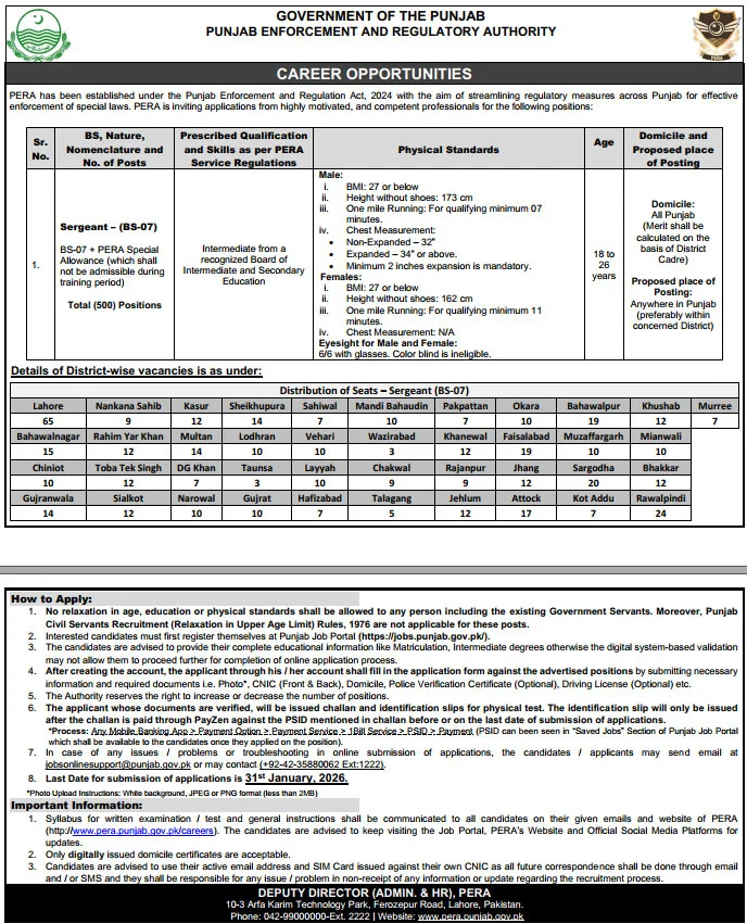 The year 2026 brings an excellent career opportunity for job seekers across Punjab with the announcement of PERA Sergeant Jobs 2026. This recruitment drive by the Punjab Enforcement & Regulatory Authority (PERA) offers hundreds of vacancies for the post of Sergeant (BS-07) and opens a gateway to a secure government job with attractive salary packages, incentives, and professional growth. The last date to apply online is 31 January 2026, and aspirants are strongly advised to complete their applications before the deadline to avoid missing out on this life-changing opportunity.